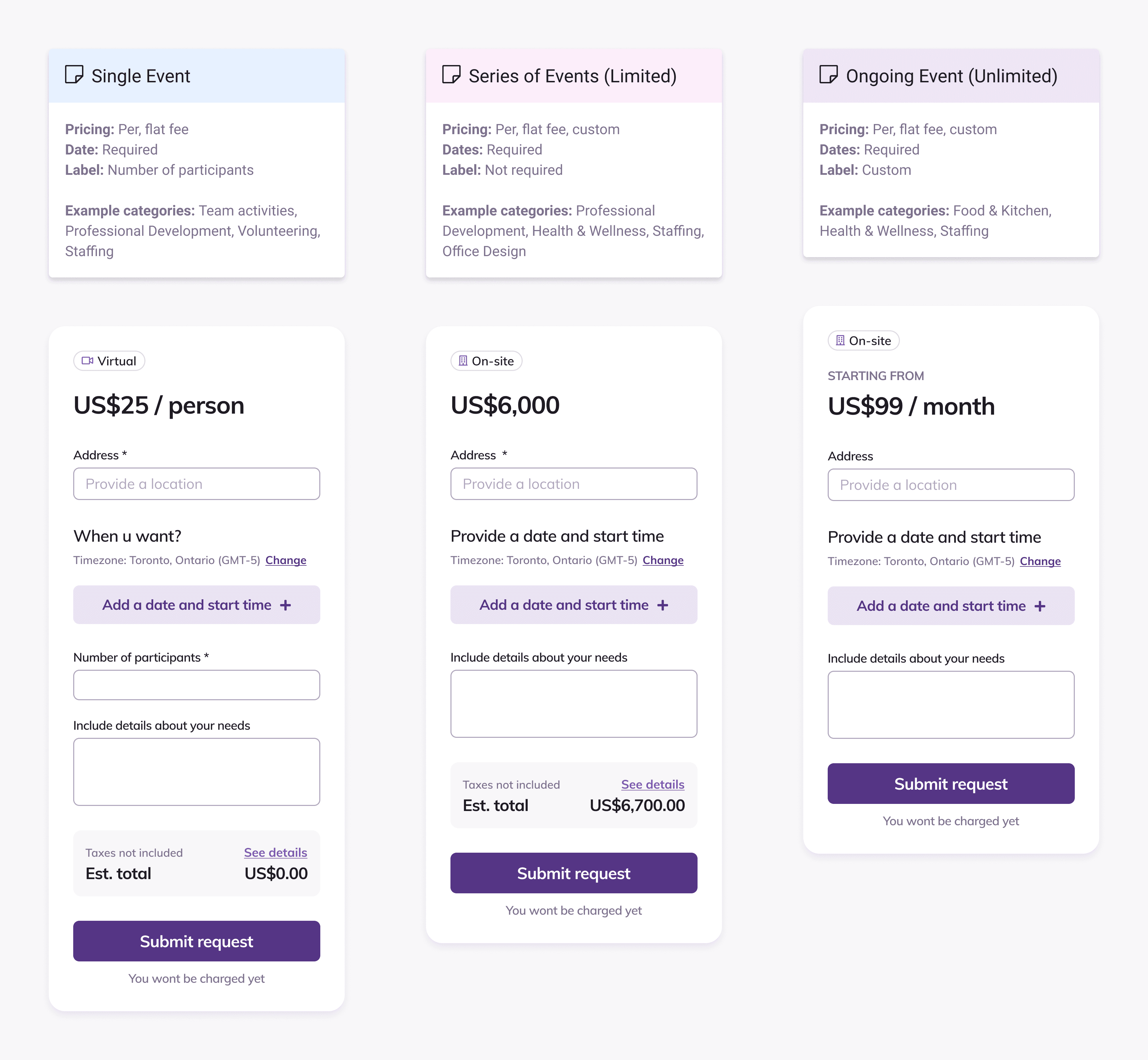 Service flexibility: Customization for both vendors and customers was essential as teams navigated uncertainty together. This booking request component was one of more than a dozen modular UI building blocks developed.